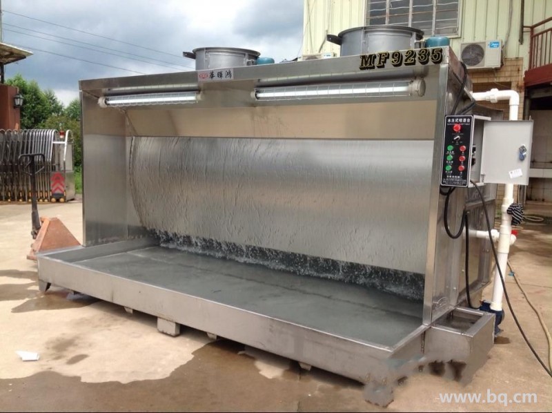 水帘柜原理: 一、由于喷漆设备是属于专用的特殊设备, 所以必须落实专人负责开启关闭和运行巡视. 二、设计时要考虑消出静电.因喷漆房给排风过滤系统的过滤棉多为化纤制品, 在给风和排尘过程中过滤材料会聚集很多的粉尘, 在风机的动力下由于摩擦会产生较多的静电、放电现 象, 如没有静电消出装置很容易引起火灾和咋.室外排尘风管如果超出建筑物高度时,还应考虑采取避雷措施. 三、在设计漆房的照明时对选用的灯具、开关一定要防,以免在开启时发生危险. 四、对排尘风机一定要选用防风机, 同时还应考虑风机的噪声不能超标. 五、在满足工艺要求的前提下尽量要选用经济适用型给排风的风机, 同时要求给风风机的给风量要比排风风量大10%,以确保漆房微正压. 六、在制作安装时一定要按设计要求去作,避免随意更改图纸, 以保证漆房的安装质量. 七、给排风系统的过滤器及漆雾净化器要定期清理,以防对系统的操作环境造成破坏.必须建立健全相关的维护保养制度,并设专人负责. 八、 对干式喷漆房过滤下来的固体废物和湿式漆房过滤下来的废渣废水必需经过妥善处理,避免二次污染.