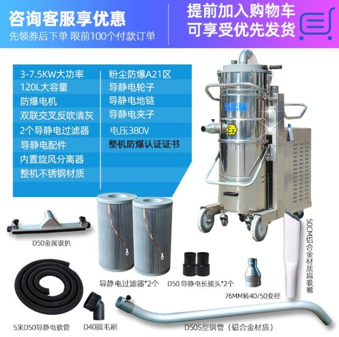 洁能瑞粉末防爆吸尘器 是一款三相电,具有5.5KW大吸力和120升容量的电动防爆工业吸尘器。整机获得防爆合格证书认证(证书编号:CNEx19.5529x),采用不锈钢材质,结实好用,50MM口径45CM宽度金属吸尘扒吸尘速度快,上下分离桶结构。洁能瑞防爆工业吸尘器专利切换清理过滤器技术,不用停机通过切换滑杆就能清理过滤器粉尘,可连续24小时工作。洁能瑞防爆工业吸尘器有21600平方厘米的过滤系统,适用于清理工作非常繁重的工厂。可吸铁钉、铁屑、钢珠,石子、沙粒、水泥灰尘 、固液混合物及少量液体或粘稠等物质,适用于机械制造、金属加工、电子、陶瓷、化工、食品、医药等多种加工场所,能与生产线或生产设备配套使用。
