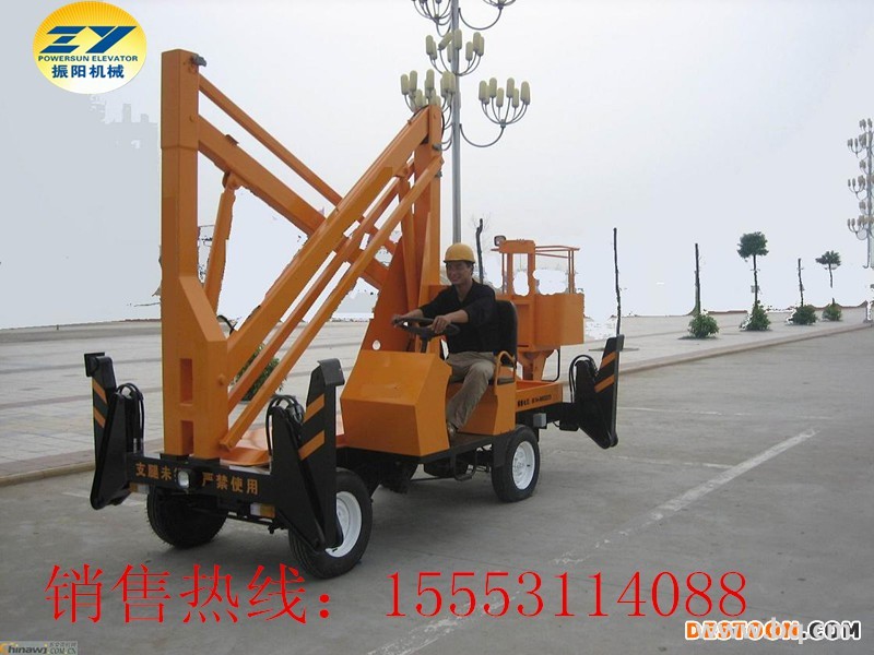 牵引曲臂式高空作业平台:移动方便,曲臂结构紧凑.采用新型优质型钢,强度高,重量轻,直接接入交流电或采用车自身动力启动,架设速度快,具有伸缩臂,工作台曲臂式高空作业升降车能悬伸作业、跨越一定的障碍或在一处升降可进行多点作业;http:/www.jnzhenyang.com平台载重量大,可供两人或多人同时作业并可搭载一定的设备;升降平台移动性好,转移场地方便;外型美观,适于室内外作业和存放。适用于既可升高又可延伸,还可360度旋转,易于跨越障碍物到达工作位置,是理想的高空作业设备.