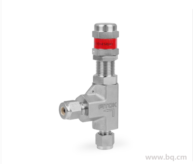 316 不锈钢, RV系列高压比例卸荷阀, 端口均为1/4" 双卡套接头, 氟橡胶(FKM)O形圈, 414bar(6000psig), -4°C至121°C(-25°F至250°F), 内通径3.6mm, 绿色弹簧, 整定压力范围3.45至20.7bar(50至300psig)